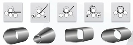 Форма и размеры детали зависят от расстояния и взаимного расположения вальцов, которые задает оператор. На станках можно формировать круглые или прямоугольные трубы, а также конусы из оцинкованной стали для водосборных воронок.